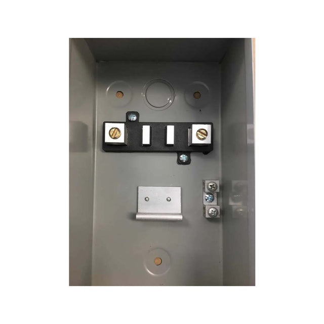 Centro de carga monofasico para intemperie con 2 circuitos y capacidad de 100A, con gabinete NEMA 3R gris, tapa embisagrada y dispositivo portacandado. Proteccion termomagnetica para acometidas domesticas, refrigeracion y maquinaria ligera.