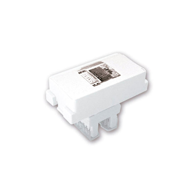 Este dispositivo de la serie 100 de Royer combina en un solo modulo una toma de datos (RJ45 para red) y una de voz (telefonica). Es una solucion practica para puestos de trabajo, permitiendo tener ambas conexiones en un mismo punto con un acabado unificado en color blanco.