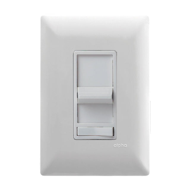 Mecanismo atenuador de luz (dimmer) de tipo deslizable (slider) para el control de intensidad de lamparas incandescentes o halogenas. Incluye placa en color Silver (Plata). Parte de la lInea de mecanismos ALPHA NIESSEN de ESTEVEZ.
