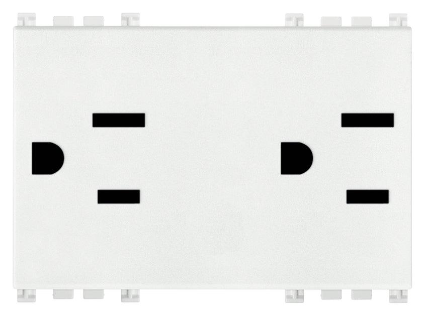 La solucion para tener dos contactos con tierra en una placa de la serie Arke de Vimar. Este modulo duplex ocupa 3 espacios y presenta un impecable acabado en color blanco, ideal para unificar tus tomas de corriente con el diseño contemporaneo de la linea.