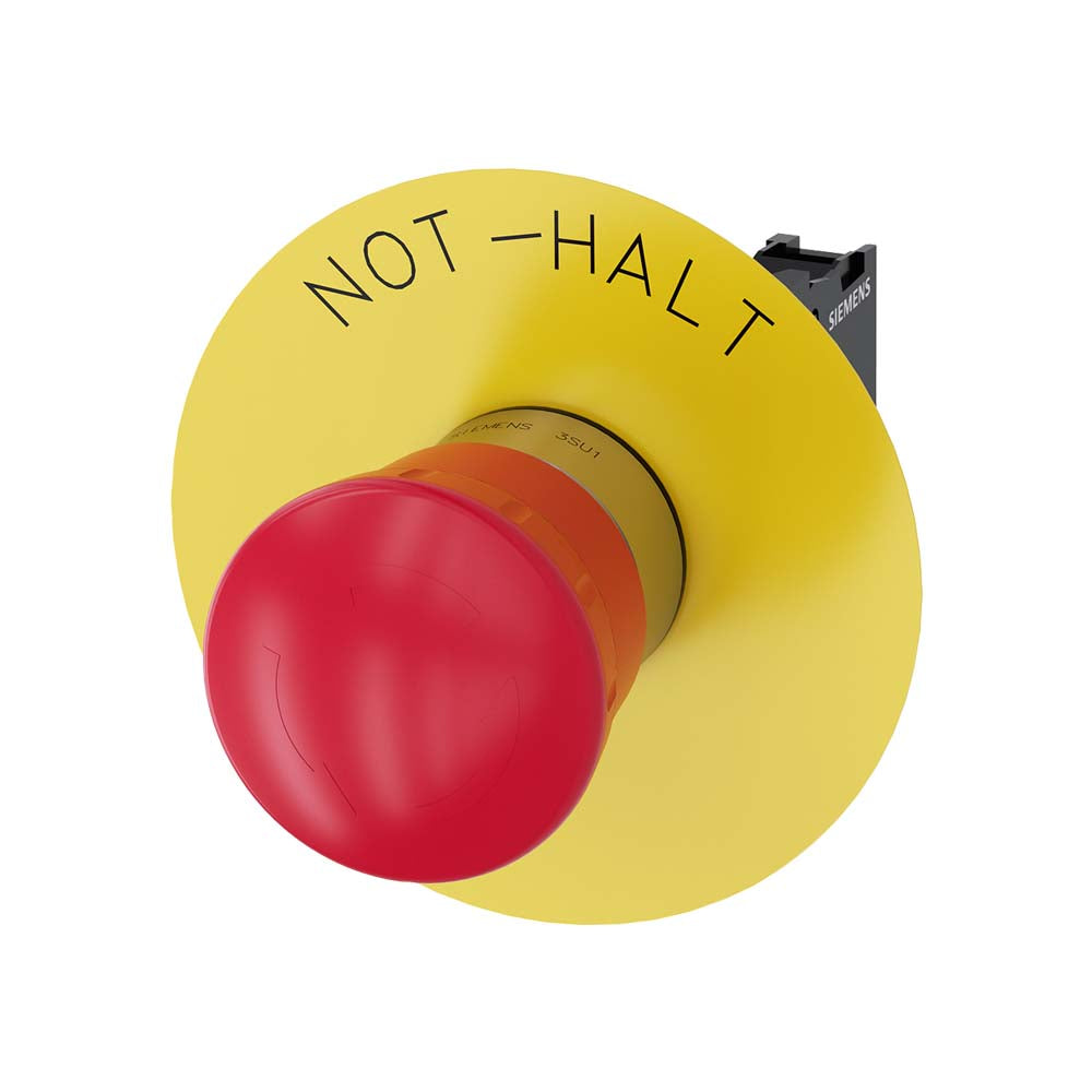 Este boton pulsador de Siemens es un dispositivo de seguridad critico. Corresponde a una unidad completa de parada de emergencia con un actuador tipo hongo de 40mm de diametro en color rojo y un cuerpo de metal brillante. Incluye un contacto normalmente cerrado (NC) y una placa de senalizacion amarilla con la leyenda NOT-HALT. Cumple con los estandares de seguridad para la detencion inmediata de maquinaria.