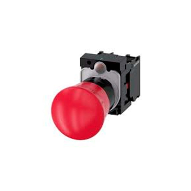 El pulsador de parada de emergencia Siemens 3SU1100-1HB20-1CG0, de la linea SIRIUS ACT, es un dispositivo completo tipo seta en color rojo, diseñado para un montaje compacto de 22 mm. Incluye una placa de soporte amarilla con la inscripcion EMERGENCY STOP y un contacto normalmente cerrado (NC). Su mecanismo de desbloqueo por giro asegura una operacion fiable, ideal para aplicaciones industriales que requieren una parada de emergencia rapida y segura