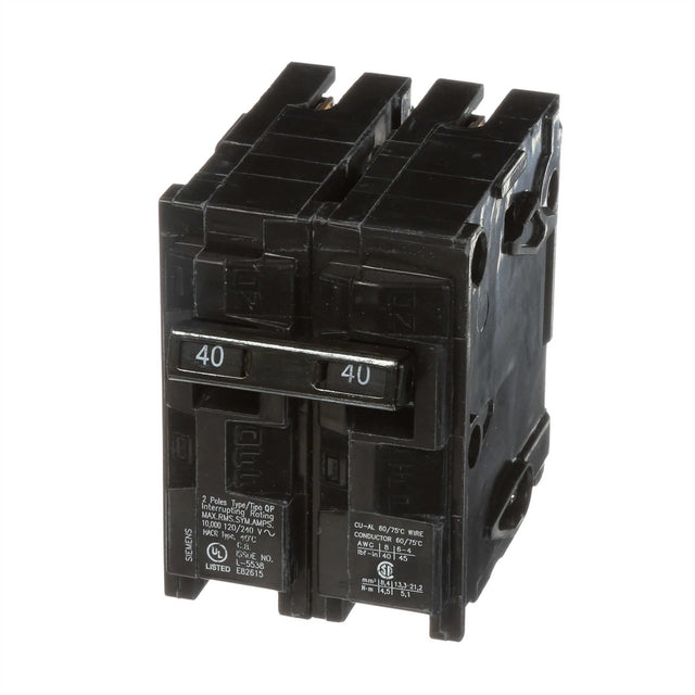 El interruptor termomagnetico Q240 de Siemens es un dispositivo de proteccion de 2 polos y 40 Amperes. Pertenece a la serie QP, disenada para montaje enchufable (plug-in) en centros de carga Siemens. Ofrece proteccion confiable contra sobrecargas y cortocircuitos en sistemas de 120/240V, ideal para cargas bifasicas como estufas electricas o aires acondicionados.