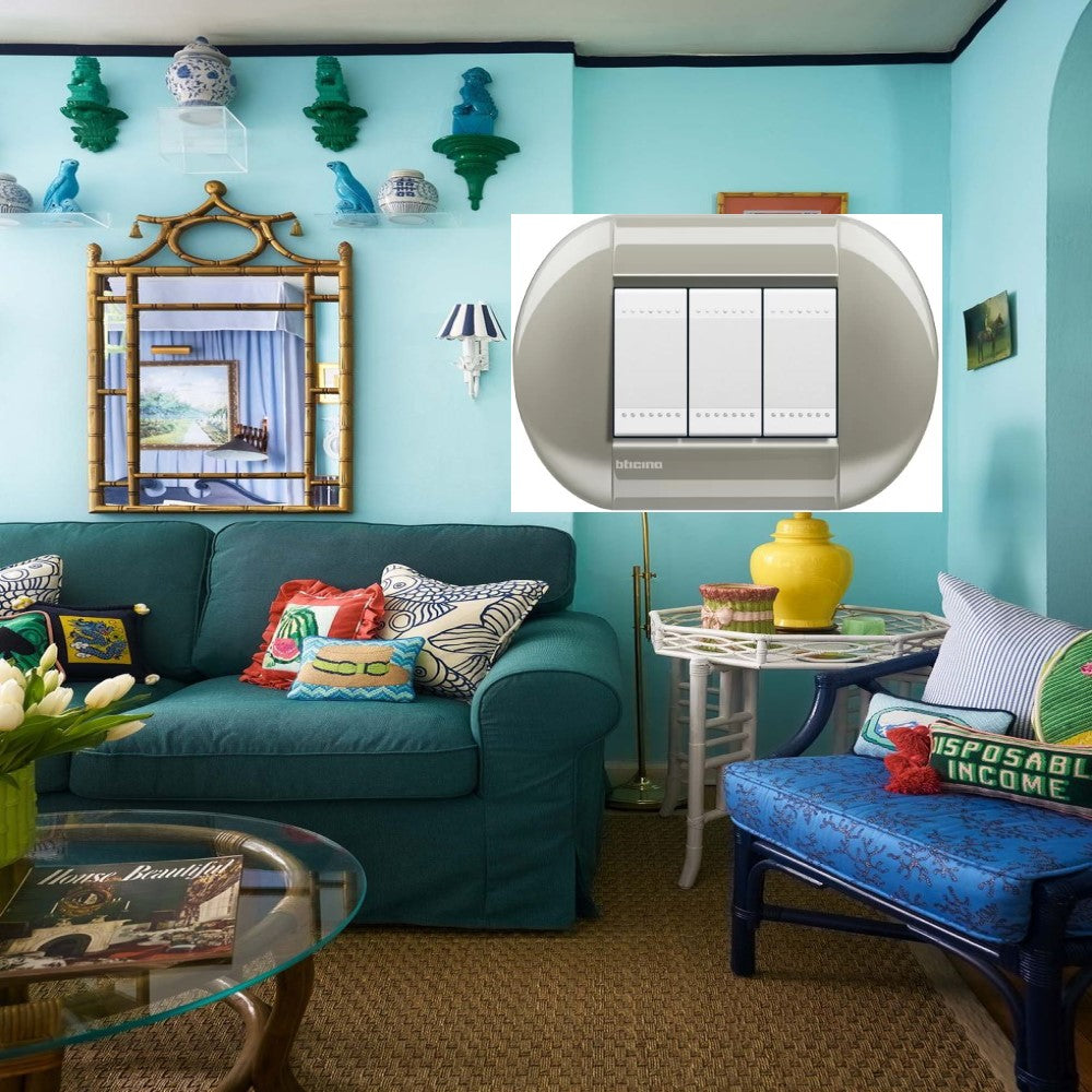 Con la placa eliptica de 3 modulos en titanio, la serie Living Light eleva el concepto de diseno interior a un nuevo nivel. Su acabado en titanio le confiere un aire de sofisticacion y durabilidad, mientras que su forma eliptica aporta un toque de modernidad