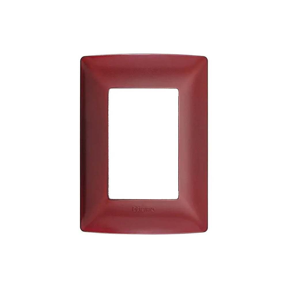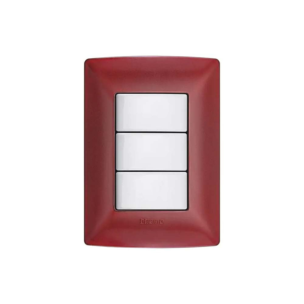 Placa decorativa de 3 modulos con chasis incluido de la marca Bticino. El acabado lacado en color rubi le da un toque distintivo y lujoso a los mecanismos electricos. Este producto se encuentra descontinuado, la informacion se proporciona como referencia.