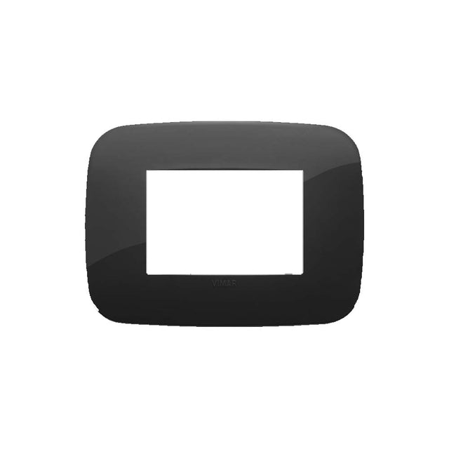 Placa de la serie Arke de Vimar con un diseno redondo para 3 modulos. Su acabado en color negro le confiere un aspecto moderno y sobrio, ideal para complementar instalaciones electricas con un toque de diseno contemporaneo. Articulo descontinuado, conservado para referencia.