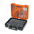 Juego de 100 brocas y puntas en estuche plastico con piezas para madera, metal, concreto y fijacion. Incluye brocas para madera, brocas HSS para metal, brocas para concreto con punta de carburo, puntas de destornillador, dados, extensiones y accesorios en estuche con compartimientos.