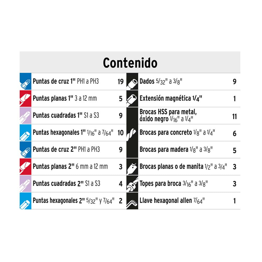 - Incluye: Puntas de cruz, puntas planas, puntas cuadradas, puntas hexagonales, dados, extension magnetica, brocas HSS para metal, brocas para concreto, brocas para madera, brocas planas (manita), topes para broca, llave allen.