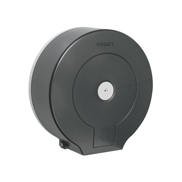 Portarollo de ABS color humo, ideal para banos. Diseno duradero, de pared, con tapa y facil de limpiar. Compatible con rollos jumbo de hasta 27.5 cm. Incluye llave de seguridad y tornilleria para instalacion.