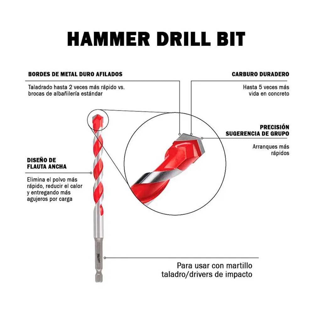 Para perforaciones de diametro pequeño en concreto, ladrillo o bloque, la broca SDS Plus de 3/16 de pulgada de Milwaukee es la eleccion profesional. Ofrece un equilibrio optimo entre velocidad y vida util gracias a su punta de carburo de 2 filos y su cuerpo de acero endurecido. Es ideal para la instalacion de anclajes tipo clavo y fijaciones ligeras. Su zanco SDS Plus asegura un agarre perfecto en el rotomartillo.