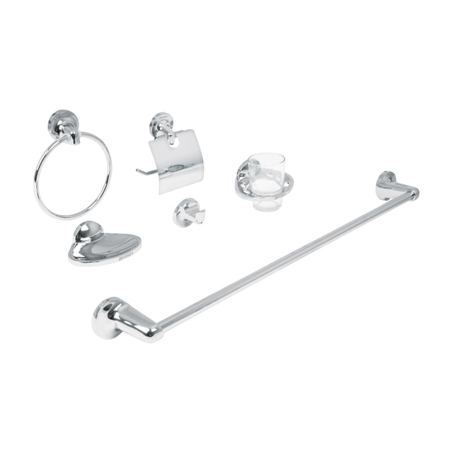 - Incluye: 1 toallero de barra, 1 toallero de argolla, 1 jabonera, 1 portarollo, 1 portavaso y 1 gancho.