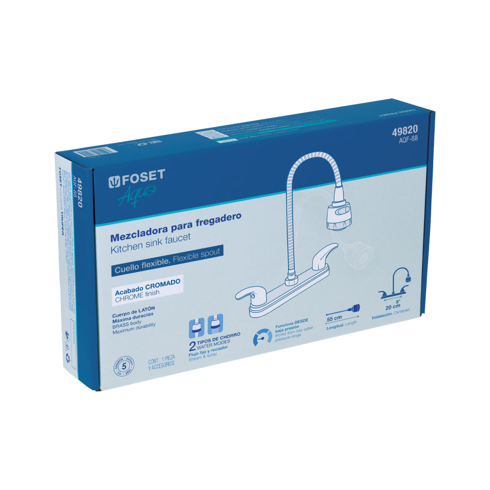La Mezcladora para fregadero modelo 49820 (clave AQF-88) de Truper Foset, con cuello flexible de 55 cm y manerales tipo palanca, ofrece maxima durabilidad y funcionalidad para cocina. Su cuerpo de laton y cubierta de acero inoxidable resisten la corrosion. Incluye cartucho ceramico de 1/4 de vuelta y selector de chorro aireado o spray. Se instala en orificios de 8 pulgadas y cumple con norma NMX-C-415-ONNCCE.