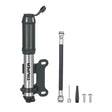 Mini bomba manual abatible para bicicleta, compacta y ligera. Incluye manguera reversible para valvulas Presta y Schrader, soporte para fijacion al cuadro e incluye adaptadores para inflables.