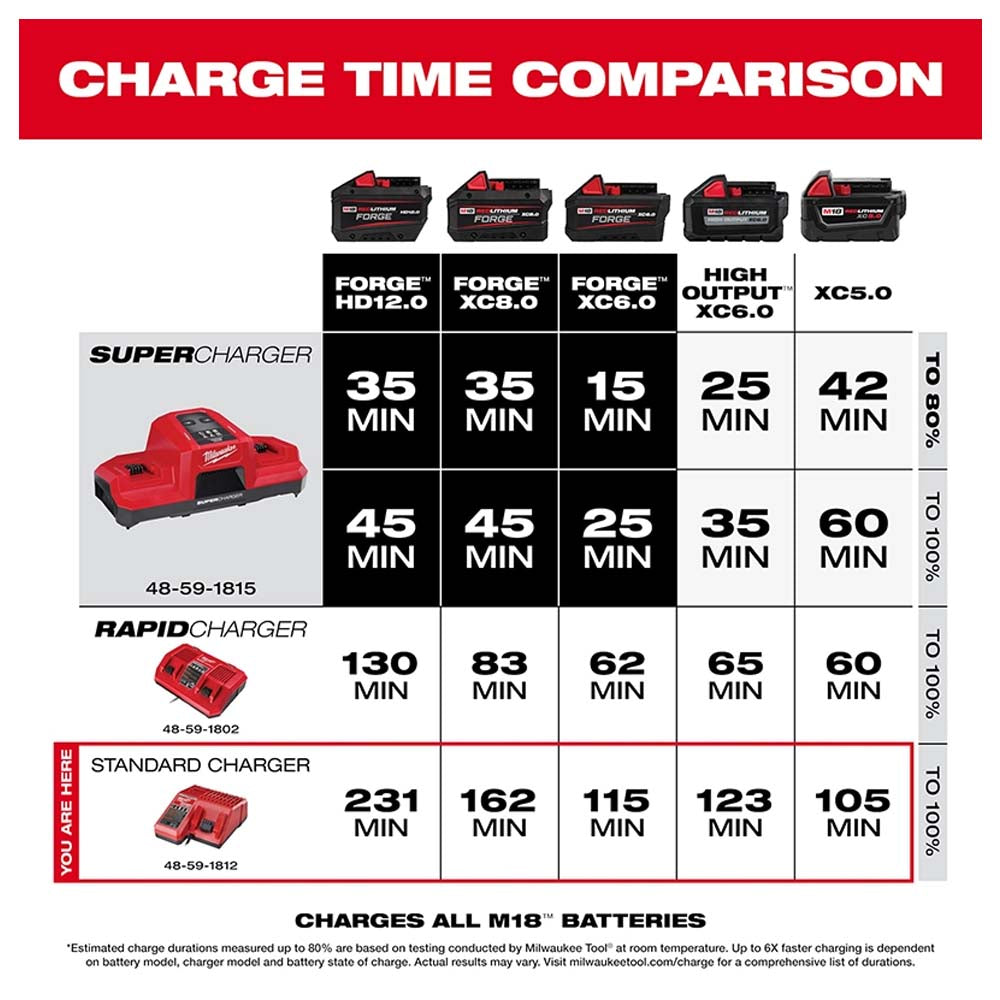 Cargador universal para baterias de las series M12 y M18 de Milwaukee. Permite cargar ambos tipos de baterias sin riesgo de incompatibilidad, con proteccion contra sobrecalentamiento y carga inteligente para prolongar la vida util de las baterias.