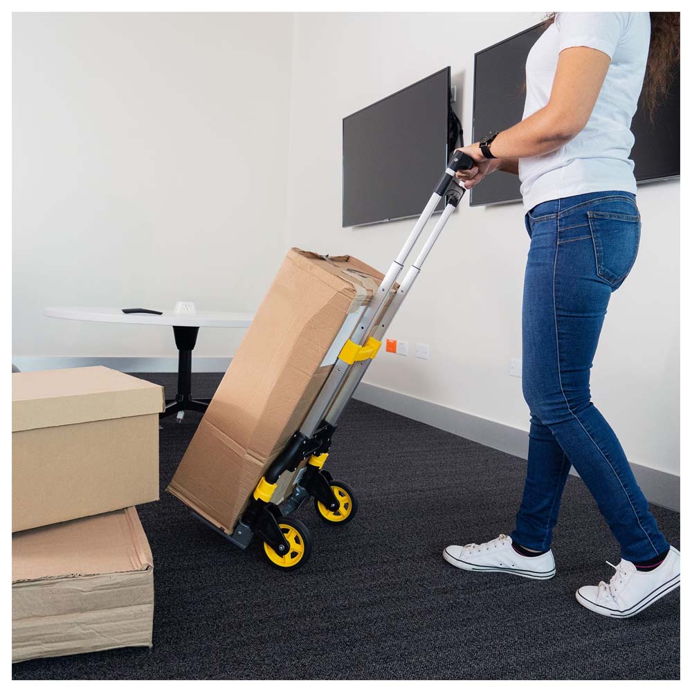 Diablo de carga plegable con capacidad 100 kg, cuerpo 100% aluminio para mayor ligereza y transportacion facil. Base de acero para resistencia estructural, ruedas de TPR y polipropileno, y mango telescopico con agarradera confortable. Diseño compacto para almacenamiento y transporte.