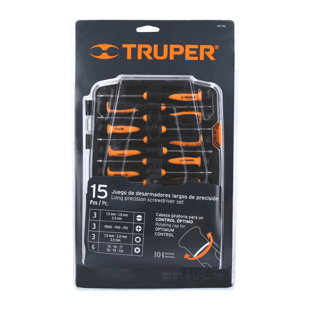 El Juego de desarmadores largos de precision modelo 14157 (JOY-15L) de Truper es ideal para trabajos de electronica, joyeria y precision. Sus puntas de acero al cromo vanadio son el doble de resistentes al desgaste que el acero al carbono. Los mangos Comfort Grip con cabeza giratoria facilitan el control y la comodidad. El estuche tipo blister organiza y protege las 15 piezas.