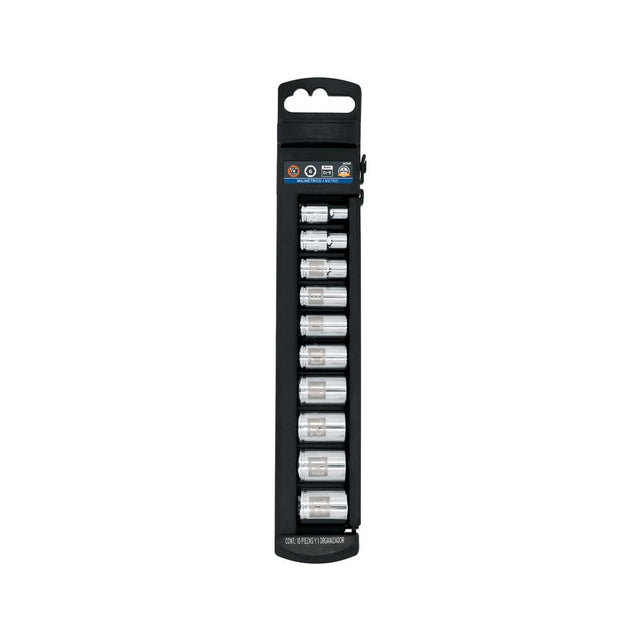 Juego de dados de 10 piezas milimetricos con cuadro de 1/4, fabricados en acero cromo vanadio para mayor resistencia. Incluye estuche para mejor organizacion y transporte.