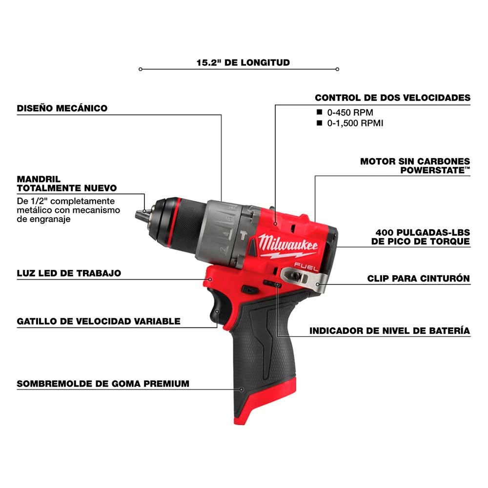 Experimenta la maxima potencia subcompacta con el kit combo M12 FUEL de Milwaukee. Incluye el taladro percutor de 1/2 mas compacto y el destornillador de impacto mas potente de su clase. Ambas herramientas cuentan con motores sin carbones para una mayor vida util y rendimiento. El kit incluye una bateria de 4.0Ah, una de 2.0Ah, cargador y estuche, ofreciendo la maxima autonomia y versatilidad.