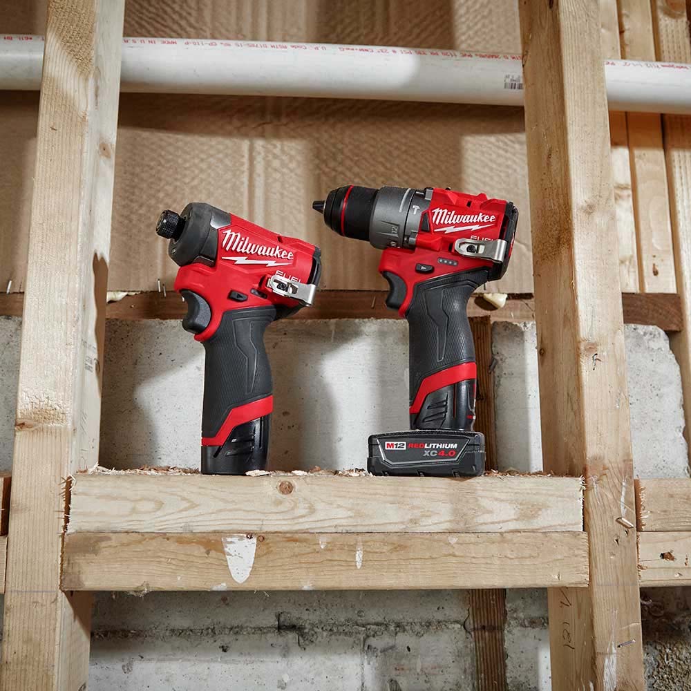 KIT COMBINADO 2 HERRAMIENTAS M12 FUEL: TALADRO DESTORNILLADOR PERCUTOR 1/2" DESTONILLADOR DE IMPACTO HEXAGONAL 1/4" BATERIA 12V. 2AMP M12 BATERIA 12V. XC 4AMP M12 CARGADOR DE BATERIA M12 MILWAUKEE