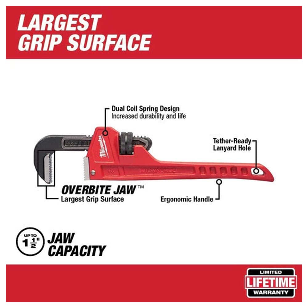 Llave Stilson para tuberia de acero de 14 pulgadas, modelo 48-22-7114. Cuenta con mordaza Overbite Jaw que proporciona mayor superficie de agarre, resortes de doble espiral para mayor durabilidad, mango ergonomico y cuerpo de acero endurecido. Ideal para trabajos de plomeria pesada