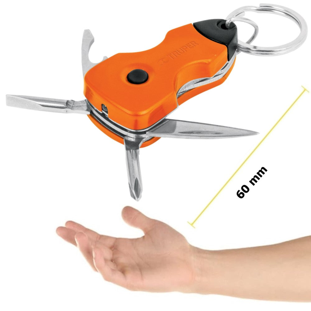 Multiherramienta 6 funciones, con LED, tipo llavero, color naranja.
