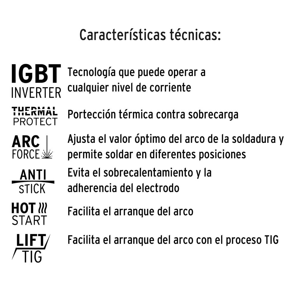 • Incluye: cables de 2 m con tenaza portaelectrodo y tierra, cable de alimentacion, careta, cepillo, correa y 1 kg de electrodos 1/8 E6013-4