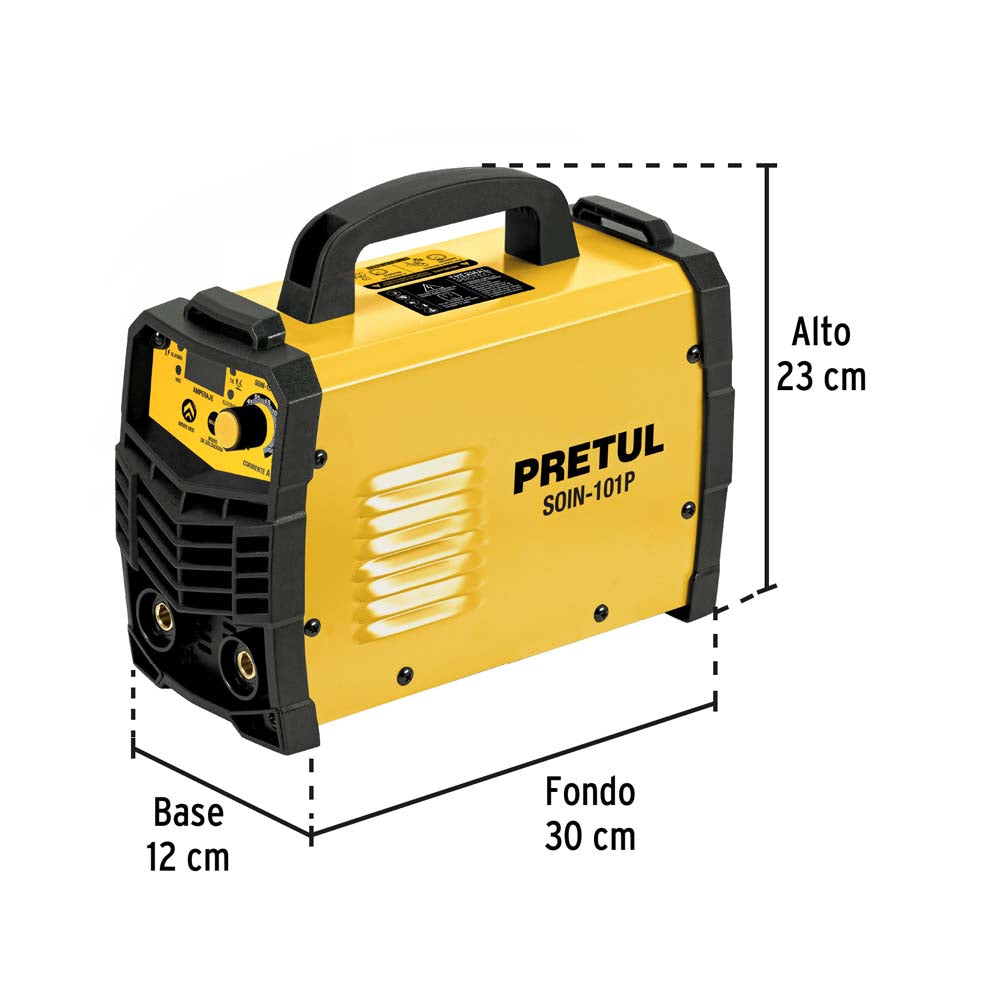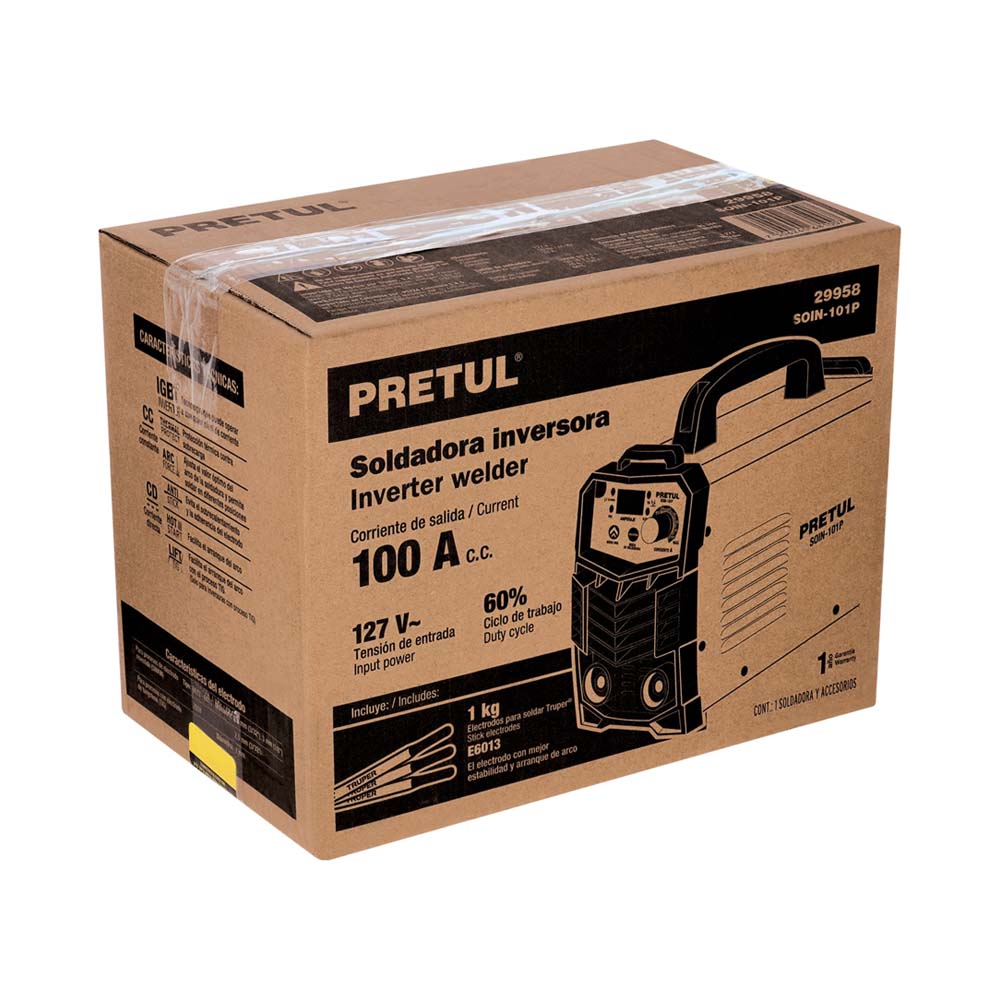 Soldadora inversora Pretul de 100A y 127V, ligera, compacta y facil de transportar. Ofrece mayor ciclo de trabajo y menor consumo electrico que una soldadora convencional. Compatible con procesos SMAW y TIG, ideal para trabajos de herreria y mantenimiento.