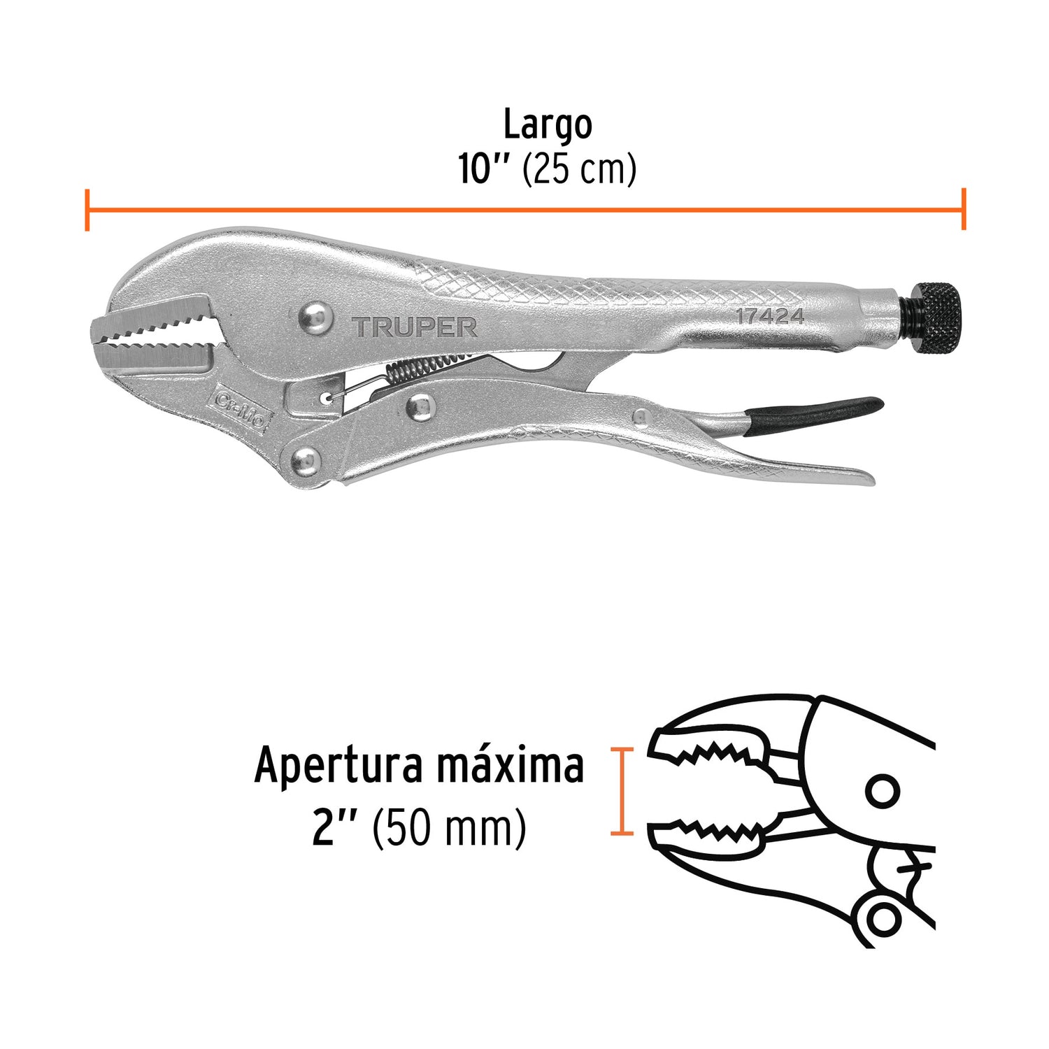 La pinza de presion Truper 17424 de 10 pulgadas con mordaza recta es una herramienta versatil para sujetar firmemente piezas planas, cuadradas o hexagonales. Cuenta con un tornillo de ajuste de presion y una palanca de liberacion rapida para un manejo sencillo. Ideal para trabajos de soldadura, mecanica y plomeria.
