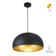 Fabricada en lamina de acero con acabado negro mate y interior dorado, aporta elegancia y calidez a cualquier ambiente. Cuenta con una base E27 compatible con focos de hasta 60 W (no incluido), permitiendo personalizar la intensidad y tono de la iluminacion segun las necesidades del espacio.