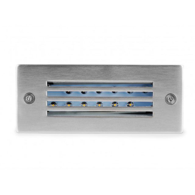 La luminaria 3320-LED de Calux es una luz de cortesia LED para empotrar en pared. Consume solo 1.2W, emite 52 lumenes de luz calida (3000K) y es multivoltaje (100-240V). Su acabado en acero inoxidable y grado IP65 la hacen ideal para señalizacion en escaleras y pasillos, tanto en interior como exterior.