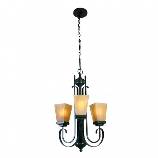 Candil de 3 luces para uso interior, con acabado verde antiguo. Estructura de acero forjado, pantallas de cristal ambar y reflectores en polipropileno. Ideal para salas, comedores o recibidores con estilo clasico.