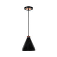 El luminario colgante MX-CL8038/N/CB de Maxxi presenta un diseno tipo campana en color negro con detalle en cobre, ideal para interiores modernos. Fabricado en lamina de acero, cuenta con base E26 y altura ajustable hasta 120 cm.