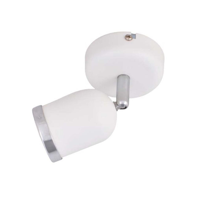Es una solucion eficiente para iluminacion direccional en interiores. Con un diseno compacto y elegante en color blanco, esta fabricado en acero, lo que garantiza durabilidad. Su potencia maxima es de 7 W, utilizando bombillas GU10-MR16 (no incluidas). Este proyector es ideal para destacar areas especificas con luz LED de bajo consumo. El cabezal es ajustable, lo que permite dirigir la iluminacion segun las necesidades del espacio. Es compatible con una tension de 127V~ 60Hz y tiene proteccion IP20, adecuado para ambientes secos.