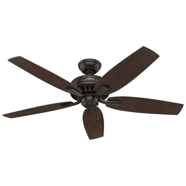 Ventilador de techo interior Hunter Newsome de 52 in en acabado Premier Bronze con palas reversibles Roasted Walnut. Motor WhisperWind® silencioso y reversible, control por cadenas. Sin luz incluida.