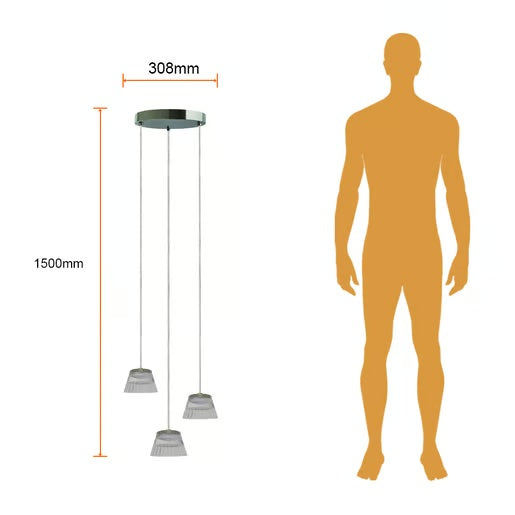 Lampara colgante LED (15CTLLED8213MV30CR) de Tecnolite. Diseno decorativo de 3 piezas en acrilico y metal acabado cromo. Consume 15.5W en total y ofrece 1000 lumenes de luz calida brillante (3000K). Altura ajustable hasta 1.5 metros. No atenuable.