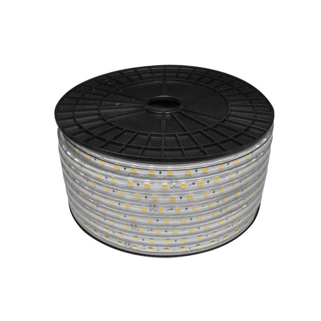 Tira de LED extraplana en rollo de 50 metros con chip tipo 5050 (60 LEDs/metro). Emite luz blanco neutro (4000K, estimado), es atenuable y opera directamente a 127V CA. Su grado de proteccion IP65 la hace resistente a polvo y chorros de agua, ideal para uso en exteriores o areas humedas. El articulo se ofrece HASTA AGOTAR EXISTENCIAS y se conserva como referencia.