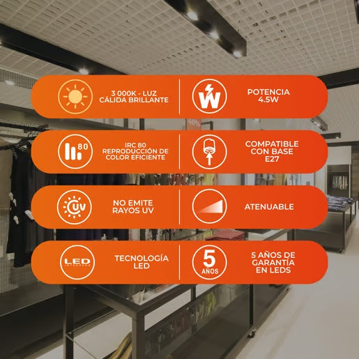 El Kit de 27 focos LED de filamento tipo globo pequeno G45 de Tecnolite es atenuable y cuenta con acabado aperlado. Cada foco de 4.5W proporciona luz calida (3000K) con un IRC de 80. Con base E27, son la opcion ideal para luminarios con pantalla o espacios donde se busca una luz ambiental suave y controlable. Su formato G45 es compacto y eficiente.