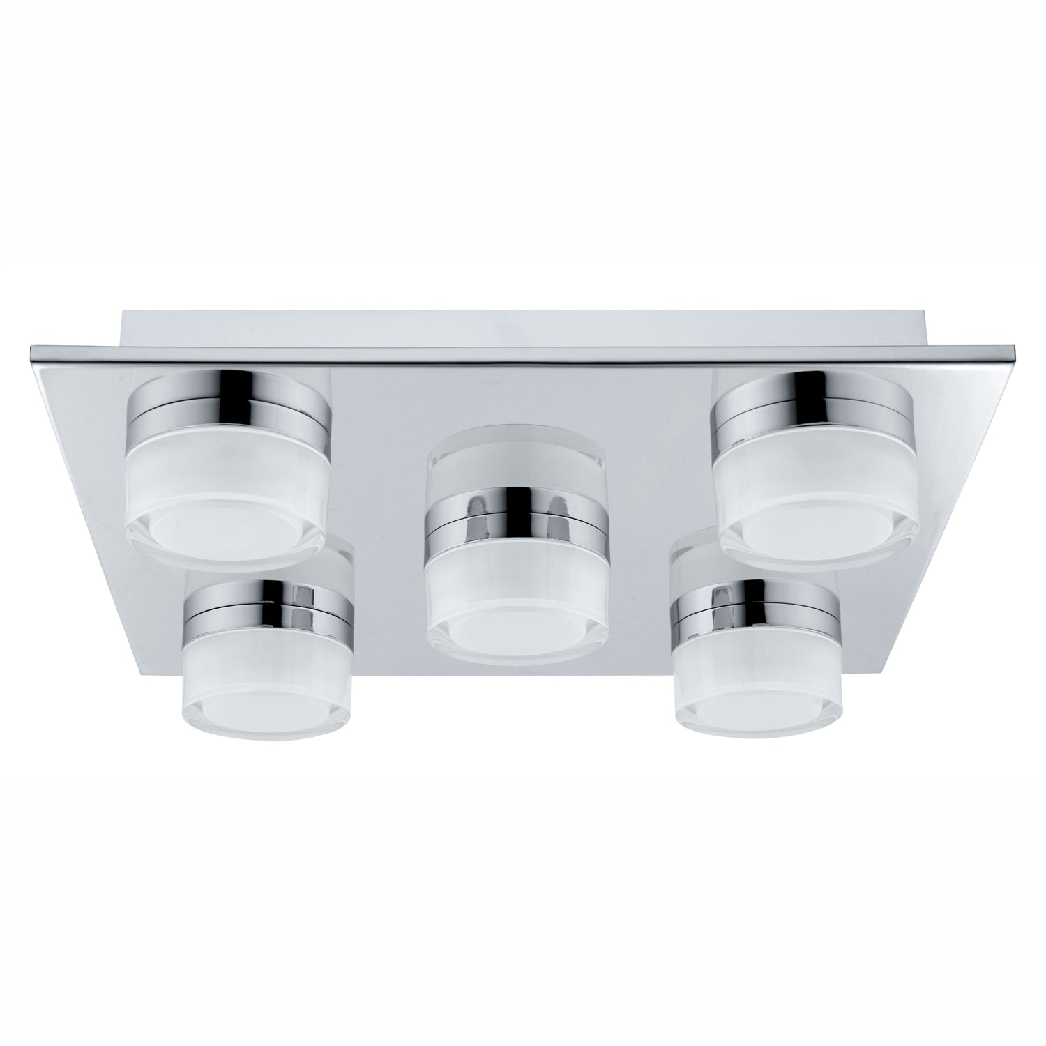 Plafon o luminario de techo de la marca Eglo con 5 spots LED dirigibles. Con una potencia total de 22.5W (5x4.5W), proporciona un flujo luminoso de 2400 lumenes. Su acabado en cromo es moderno e ideal para cocinas o estudios. Este producto se encuentra descontinuado, la informacion se proporciona como referencia.
