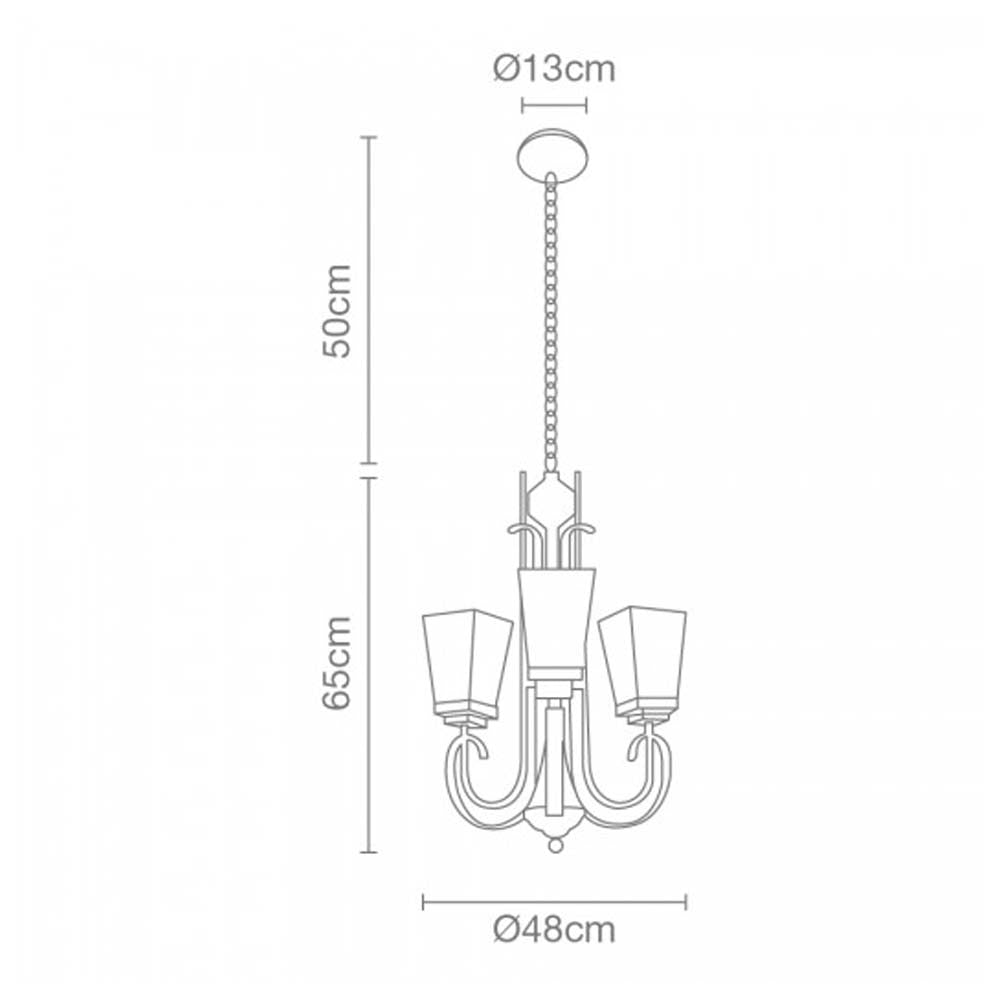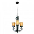 Candil de 3 luces para uso interior, con acabado verde antiguo. Estructura de acero forjado, pantallas de cristal ámbar y reflectores en polipropileno. Ideal para salas, comedores o recibidores con estilo clasico.