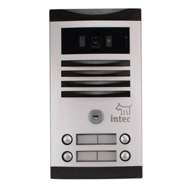 La telecamara de Intec es la unidad exterior para un sistema de videoportero en un edificio o condominio pequeño. Cuenta con una camara a color y cuatro botones de llamado, uno para cada departamento o casa. Su construccion es robusta para resistir a la intemperie.