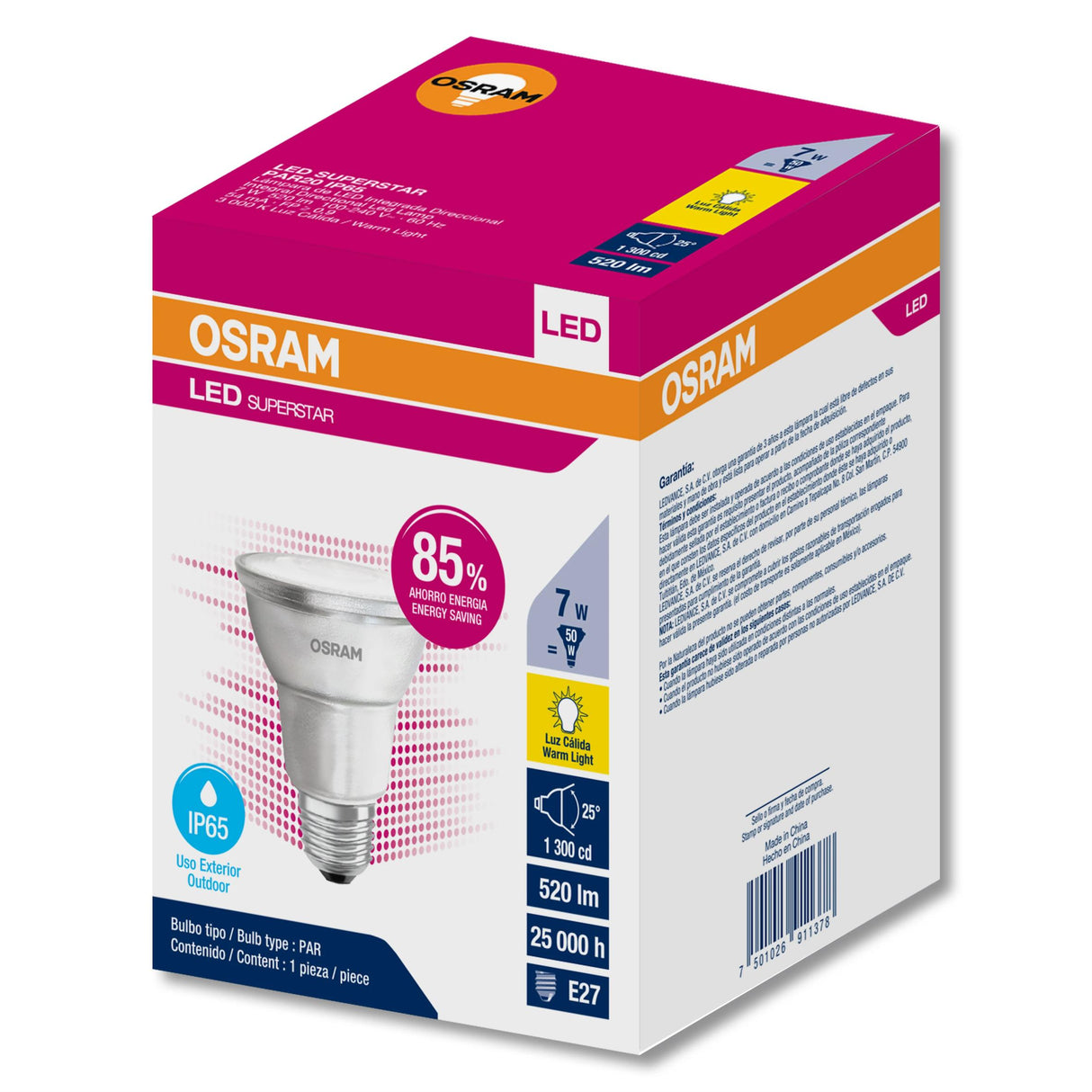 Lampara LED Superstar PAR20 de 7W con proteccion IP65 para uso en exteriores. Temperatura color 830 (3000K) luz calida. Opera en rango amplio 100-240V, base E27 universal. Construccion sellada resistente a agua y polvo, ideal para iluminacion de jardines, fachadas, terrazas. Reemplazo de halogenos de 50W con 85 porciento de ahorro. Aluminio y policarbonato de alta calidad garantizan durabilidad en intemperie. Articulo descontinuado, se conserva como referencia.