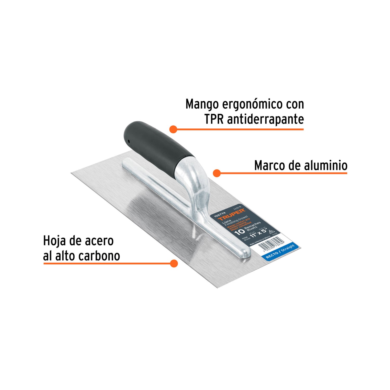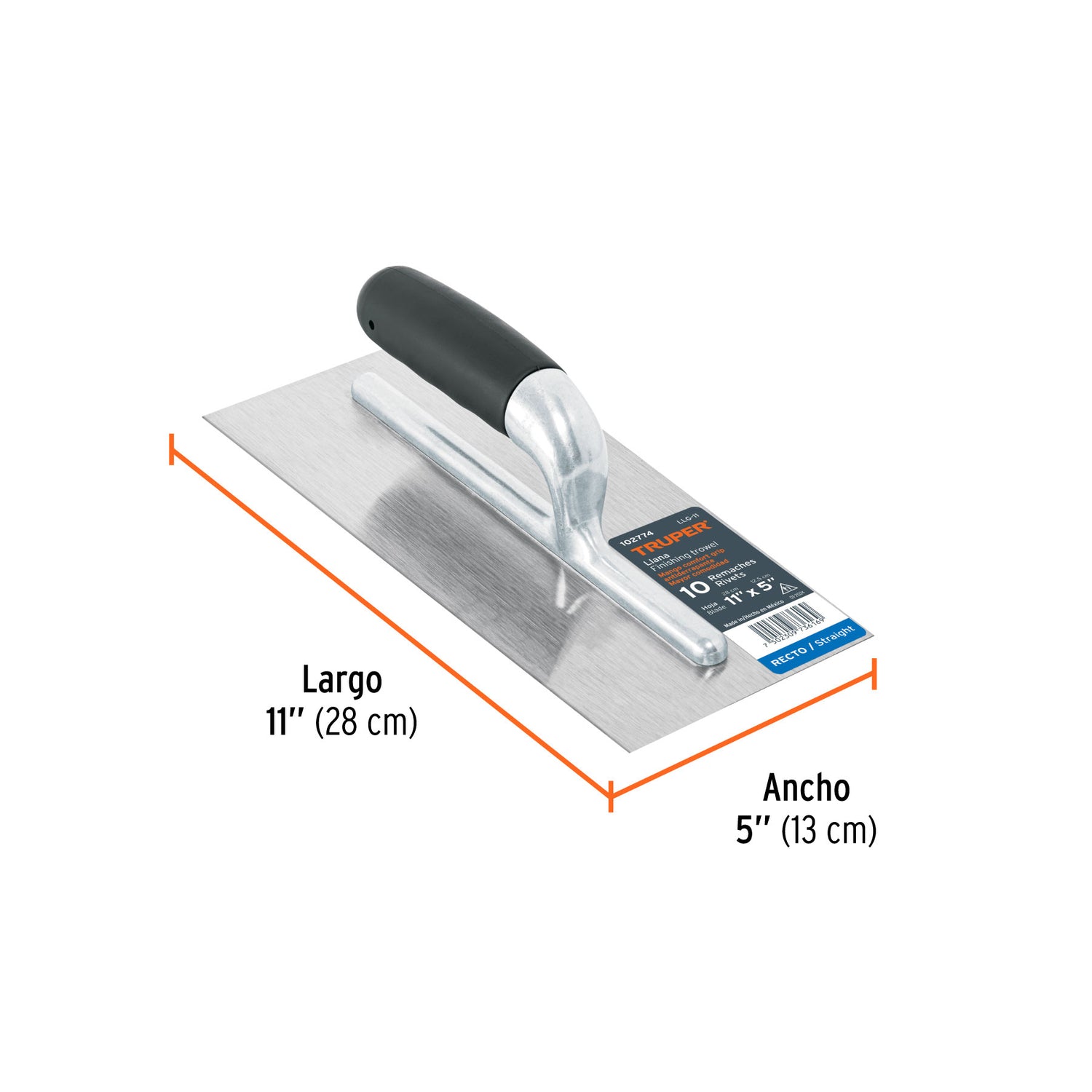 Herramienta profesional (llana) de canto recto con una hoja de 11 pulgadas, sujeta por 10 remaches para mayor durabilidad. Mango ergonomico con tecnologIa Comfort Grip para un uso prolongado. Ideal para aplicar, extender y alisar mortero, cemento o yeso. Marca TRUPER.