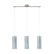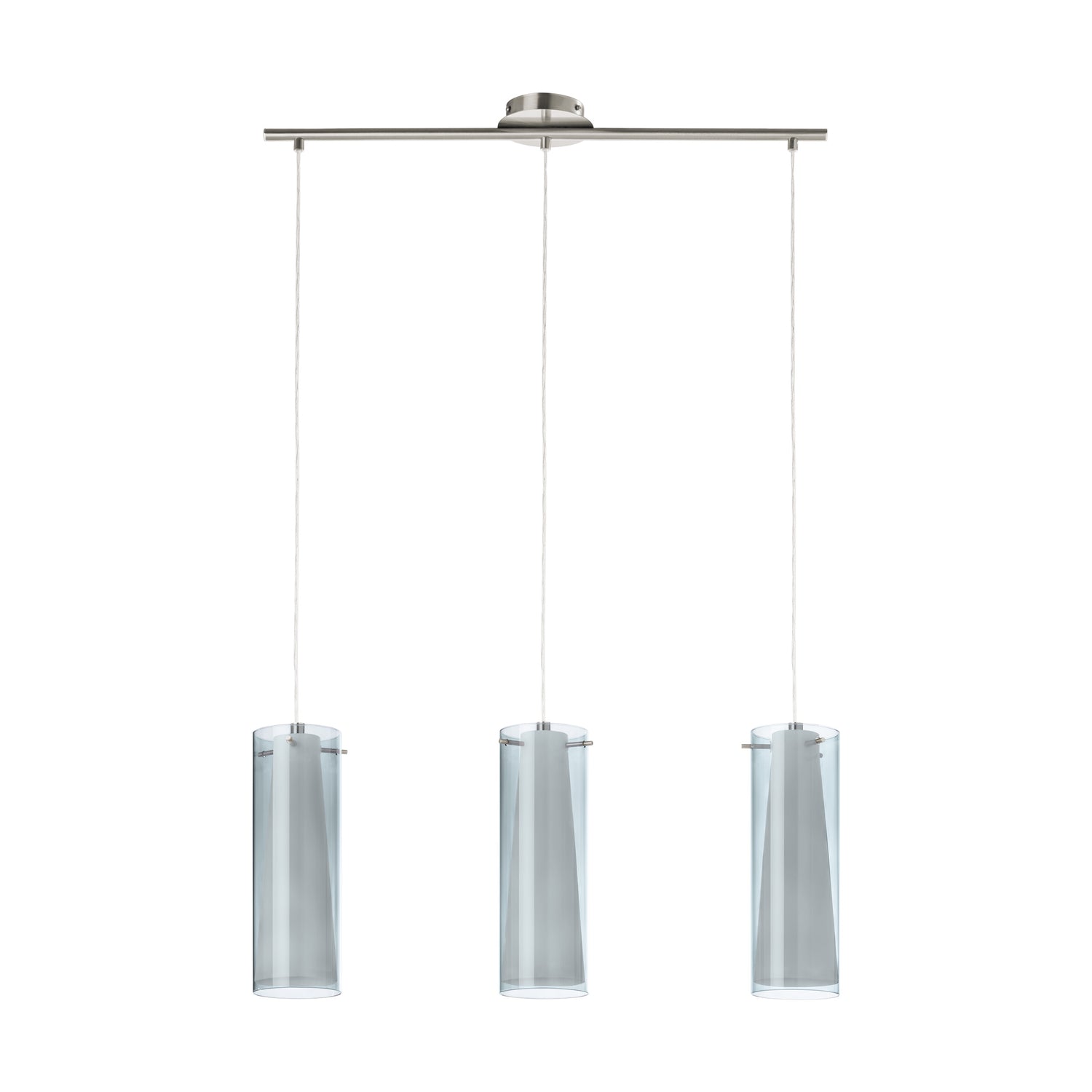 Luminario colgante de la serie Pinto Nero Eglo. Cuenta con **tres focos** con base **E26** (tipo estandar, no incluidos) para una potencia maxima de 60W por foco. Diseno moderno y minimalista, ideal para sobreponer en mesas o barras de cocina. El articulo se ofrece HASTA AGOTAR EXISTENCIAS y se conserva como referencia.