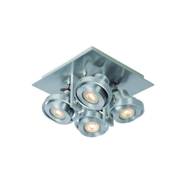 Luminario de sobreponer en techo de la marca Class. Su diseno cuadrado con acabado en aluminio cuenta con 4 cabezas dirigibles para focos LED tipo GU10 (incluye focos de 3W). Ideal para iluminacion de acento en comercios o residencias. Este producto se encuentra descontinuado, la informacion se proporciona como referencia.