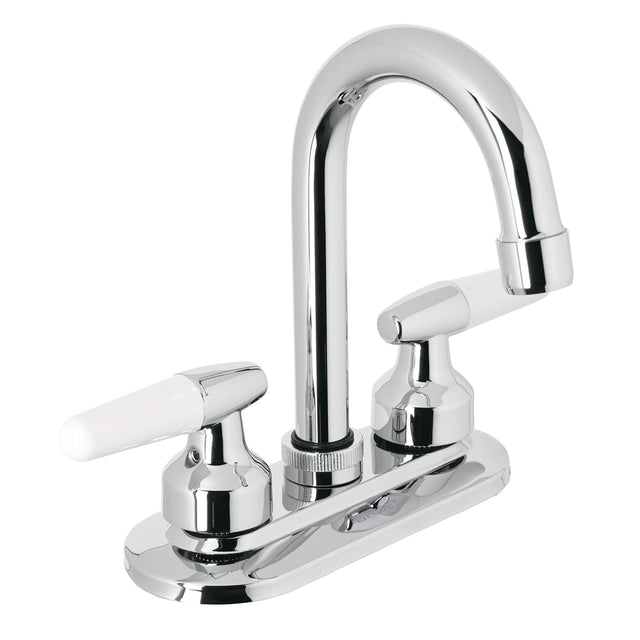 Mezcladora para lavabo con instalacion a 4 pulgadas entre centros. Cuenta con un cuello alto tipo bar para mayor comodidad y elegantes manerales tipo cono que facilitan su operacion. Su acabado cromado le da una apariencia clasica y duradera, ideal para cualquier estilo de baño.