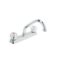 Mezcladora economica para fregadero con instalacion a 8 pulgadas. Cuenta con un cuello corto y funcionales manerales de acrilico transparente. Es una solucion basica y duradera, ideal para tarjas pequeñas, areas de servicio o proyectos donde el presupuesto es un factor clave.