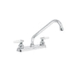 Mezcladora tradicional para fregadero con instalacion a 8 pulgadas. Presenta un cuello de ganso largo que facilita el lavado de objetos grandes y manerales tipo cono para un control preciso del agua. Su acabado cromado es resistente y facil de limpiar, una opcion clasica y fiable para cualquier cocina.