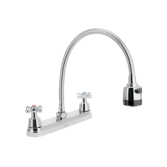 Moderna mezcladora para fregadero de la linea Aqua de Foset, con instalacion a 8 pulgadas. Fabricada en acero inoxidable, cuenta con un cuello flexible que permite dirigir el chorro de agua con precision y una llave de control tipo cruceta. Es la combinacion perfecta de durabilidad, diseño y funcionalidad para tu cocina.