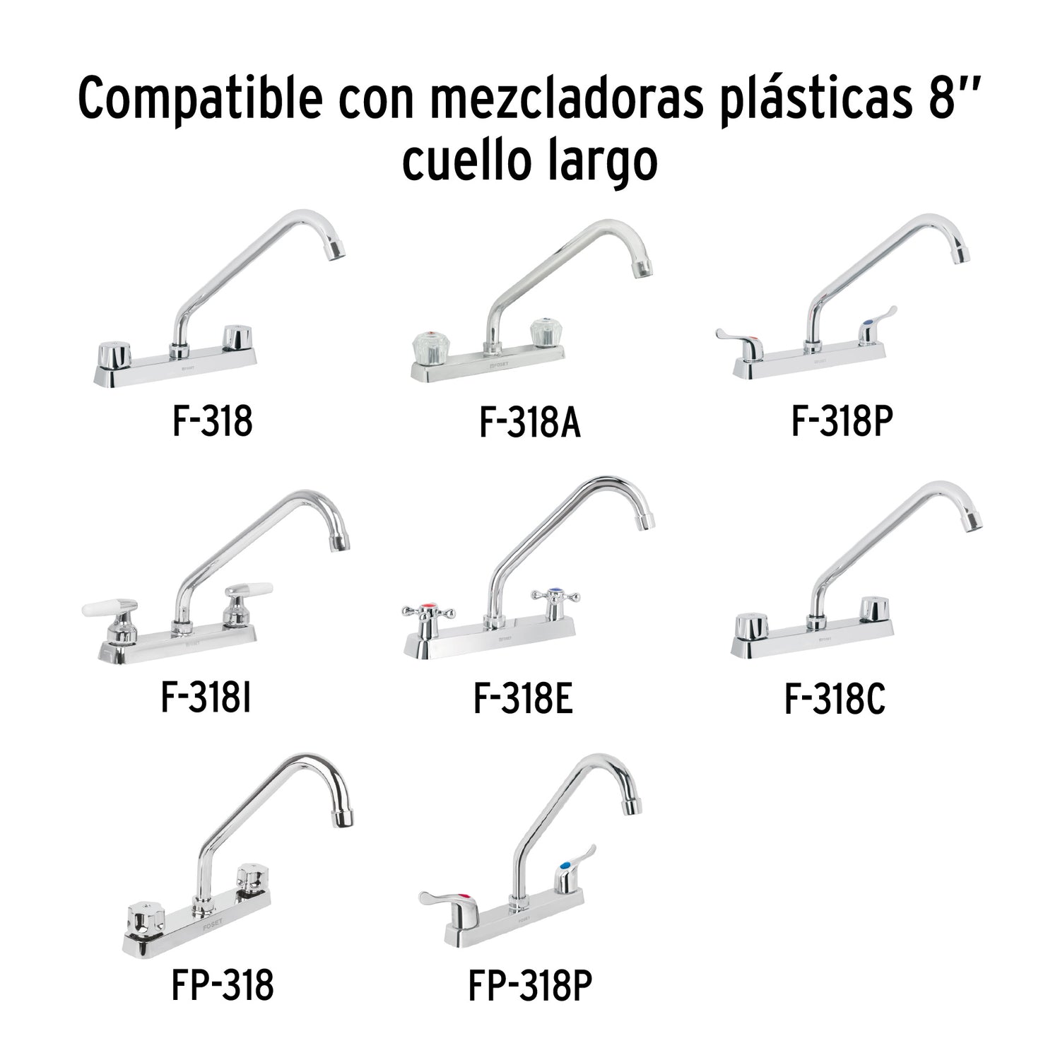 Mezcladora para fregadero con instalacion a 8 pulgadas. Presenta un cuello largo y robustos manerales hexagonales que ofrecen un excelente agarre. Su mecanismo de cartucho ceramico de 1/4 de vuelta asegura un funcionamiento suave, preciso y una larga vida util sin goteos.
