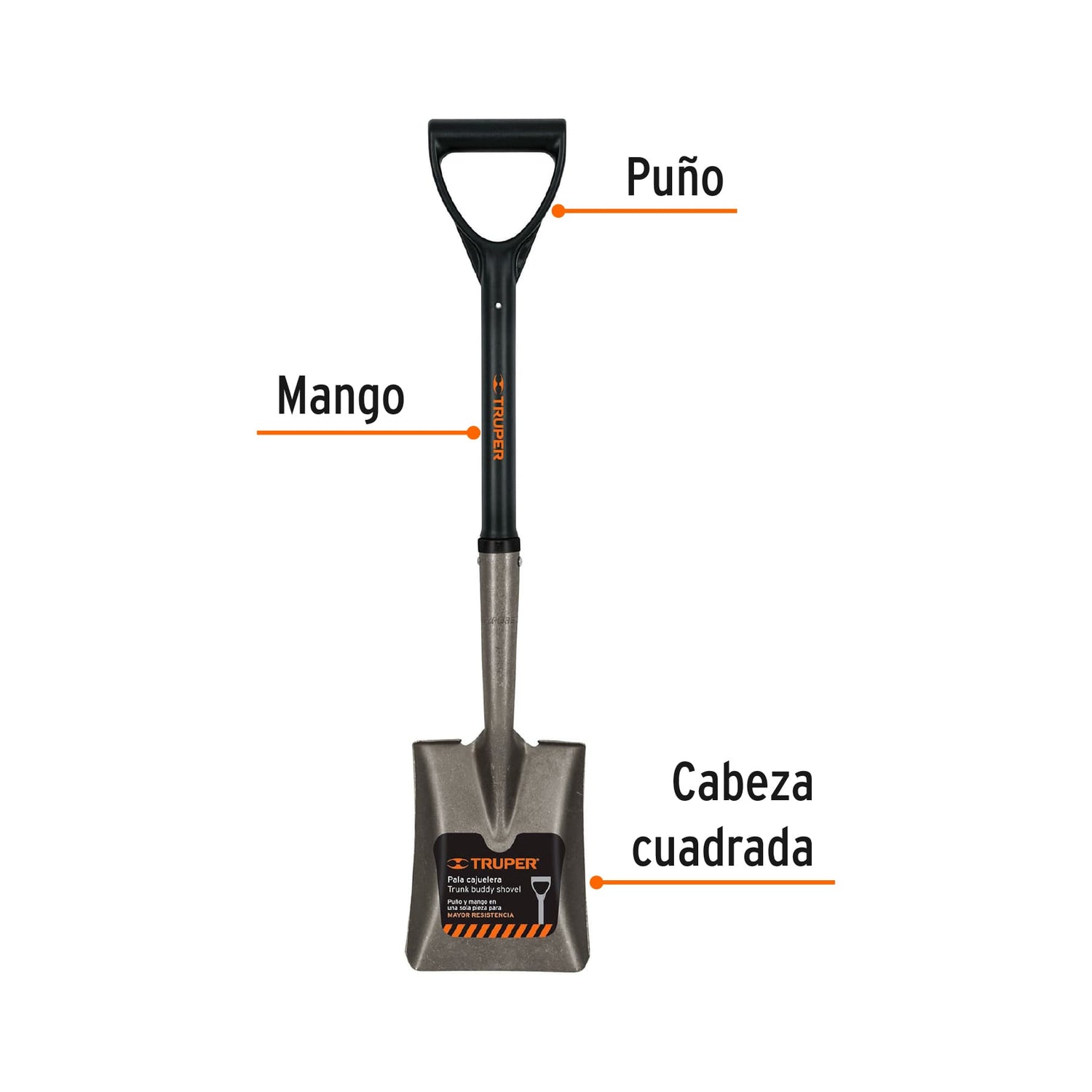 Pala tipo cajuelera (corta) con hoja cuadrada, ideal para trabajos en espacios reducidos, jardinerIa o para llevar en el vehIculo. Mango en forma de D fabricado en fibra de vidrio, mas ligero y resistente. Marca TRUPER (Construccion).